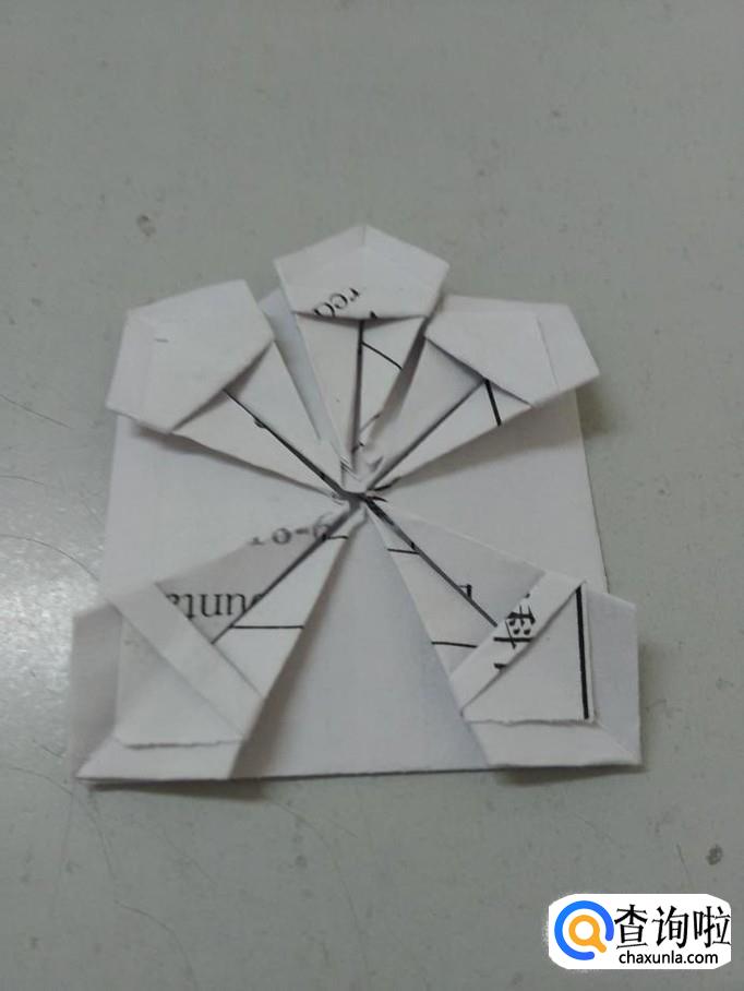 另外三小块也按同样的方法折进相应的夹层中,折后如下图,这就是花篮的篮子。