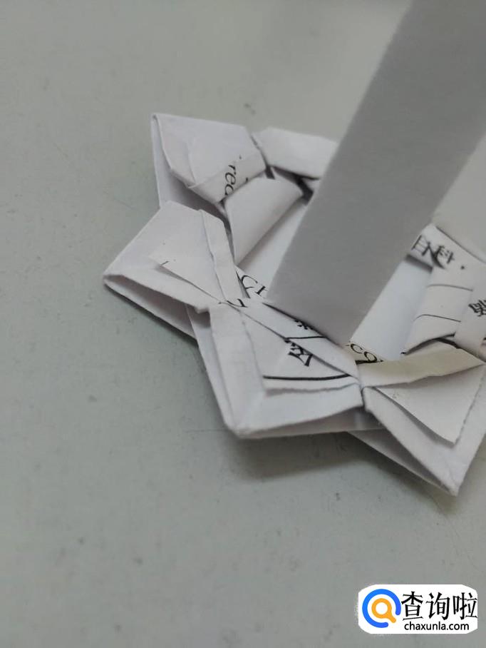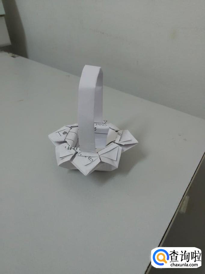 把细长条的两端插进两个花瓣的夹层中,上面弯一下,当作花篮的提把儿。