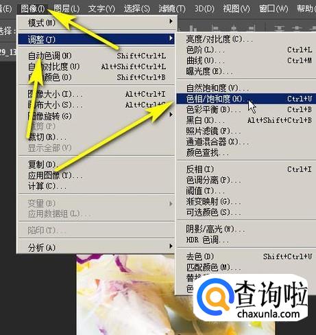鼠标移到菜单栏这里,点击图像,弹出下拉菜单。点击:调整,再点:色相/饱和度