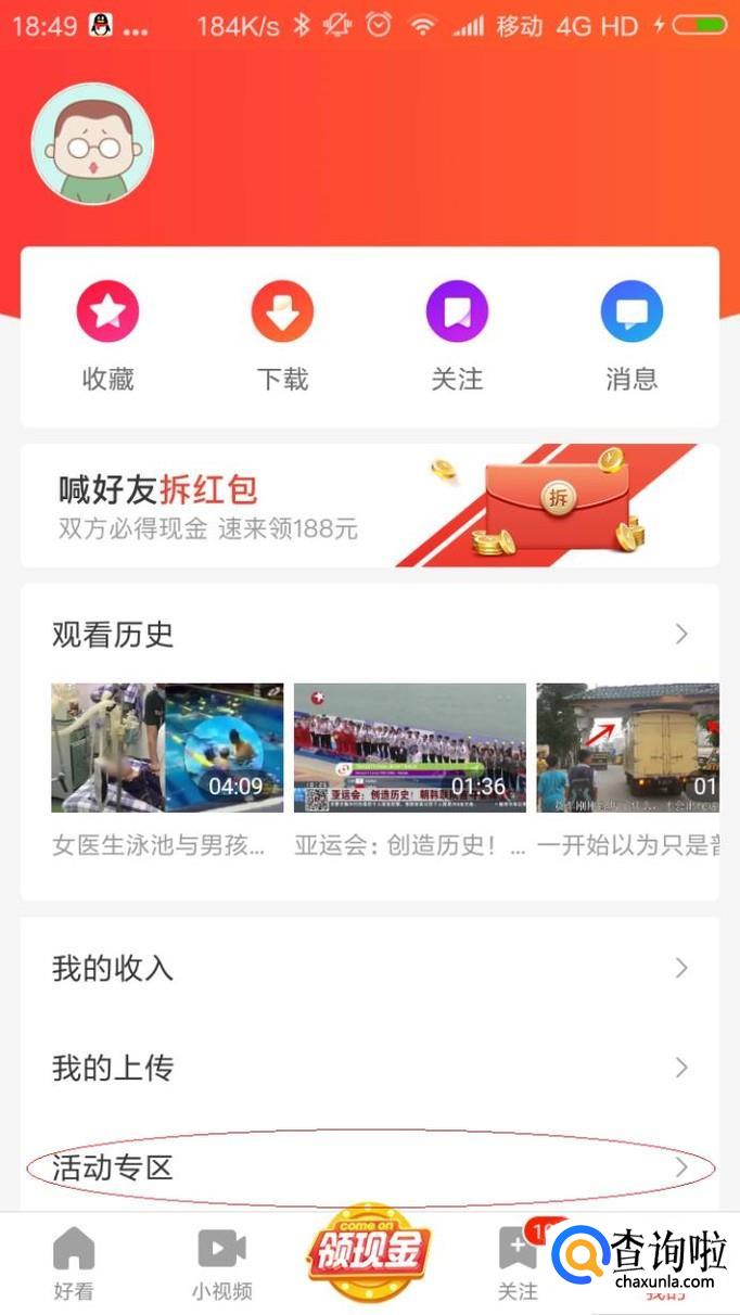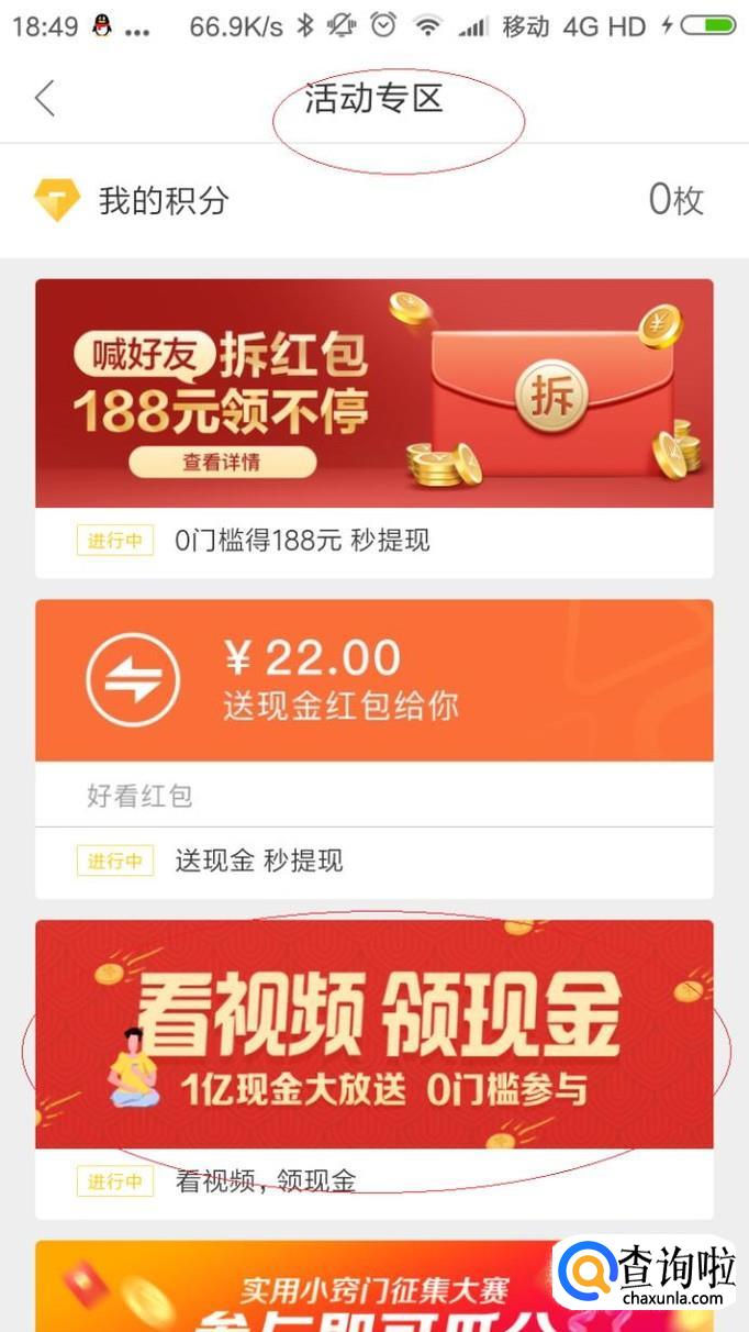 如图所示,唤出"活动专区"选项。垂直滑动选项区域,点击"看视频领现金"图标。