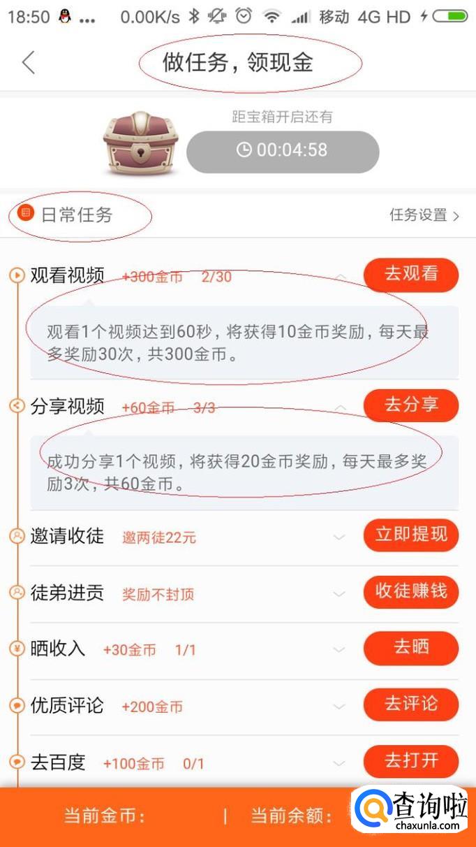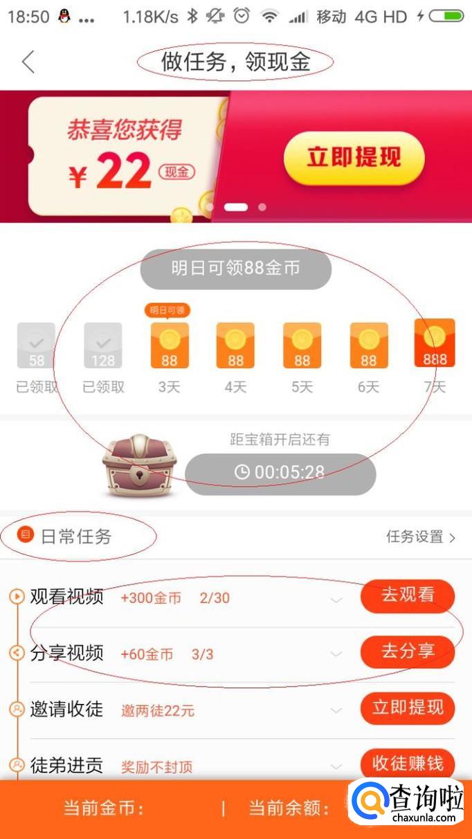 唤出"做任务领现金"选项,如图所示。点击"签到"和"宝箱"按钮完成每日任务,选择"日常任务"选项。