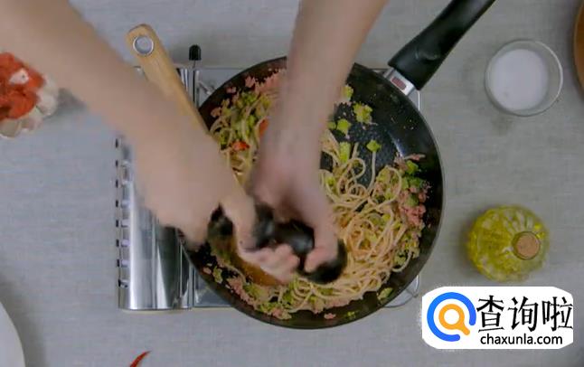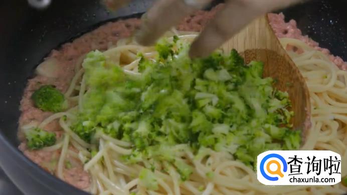 接着加一点煮面的汤和明太子一起翻炒,把煮好的西兰花和面放入酱汁中翻炒。
