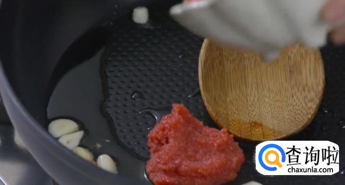 接着拿一口平底锅,加一点橄榄油,放入蒜片,小火炒香,加入明太子。