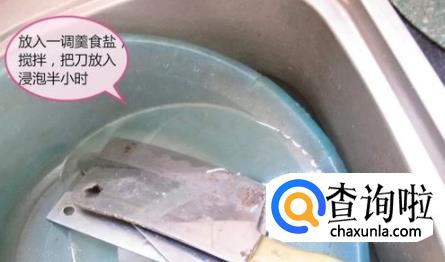 接下来将菜刀放入盐水中浸泡半个小时,这样有利于磨刀使其更加锋利。