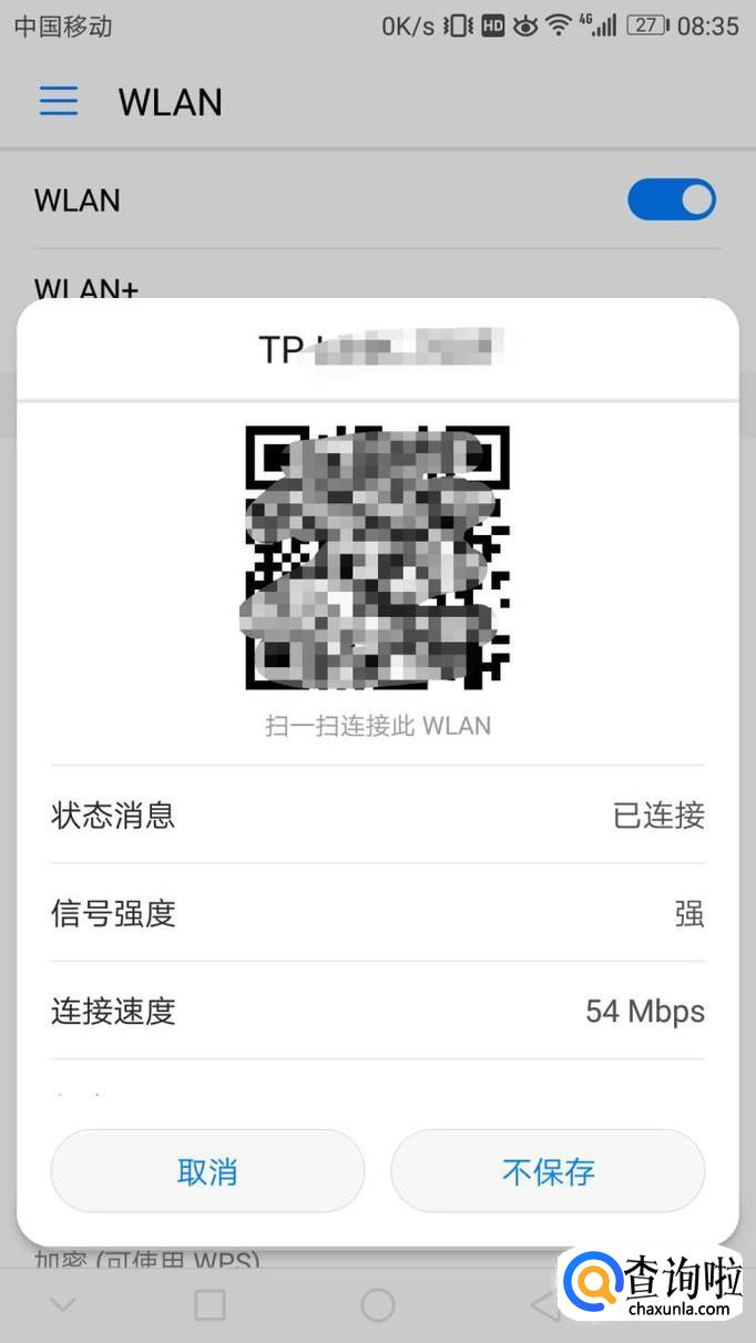 点击进入“WLAN”,选中你所连接到的wifi,此时会出现一张二维码图,截图保存到手机上。