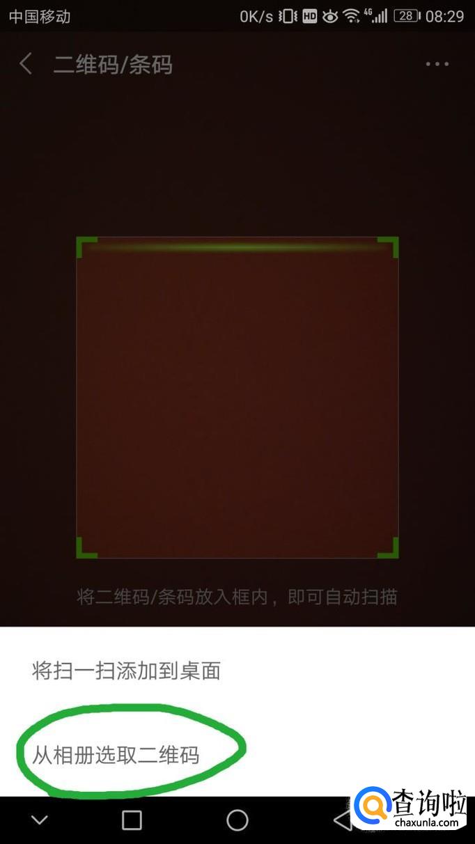 然后打开微信,打开“扫一扫”,选择“从相册选取二维码”,选择刚刚保存到手机的二维码图片。