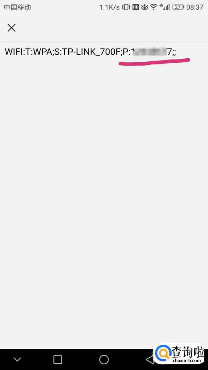 自动扫描二维码成功后,将显示如下图所示结果,其中“p:”后面即为该wifi的加密密码。