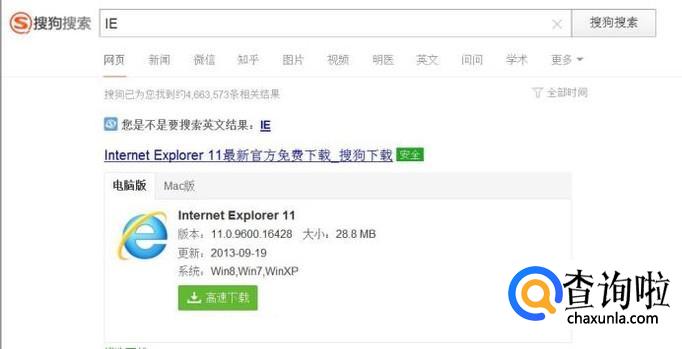 首先,使用搜索引擎搜索“IE”关键字,在搜索结果页面中,点击下载IE 11浏览器安装包。