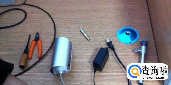 准备好安装摄像头配套零件,钳子、螺丝刀、摄像头、摄像头充电器、摄像头支架、底盘、BNC接头两个,连接BNC线。