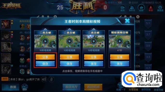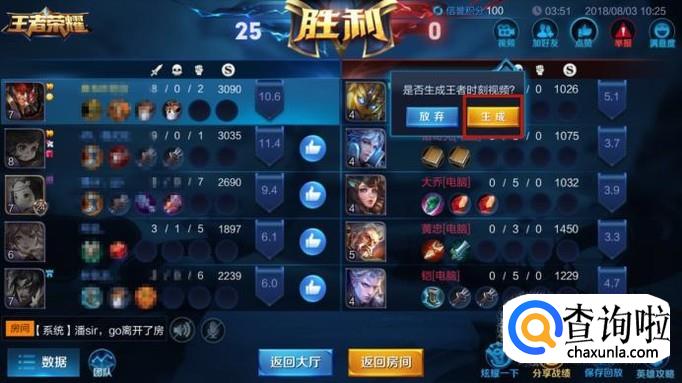 然后随便开始一局比赛游,戏结束就会看到一个王者时刻的对话框,点击生成如下图所示。