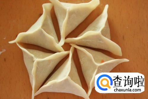 将水饺皮平分三边对折,边与边的交合处相黏,可以沾点水帮助沾黏,这样就完成啦。 - 08