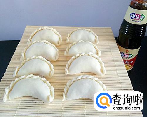 取饺皮一张于掌心,放入适量馅,对折成半圆形,捏牢中间,将右半边饺皮封口,同样将左半边饺皮也封口,将饺皮封牢,然后把饺子两端向中间弯拢,将两端饺边相互捏牢,使半圆形的边微微向上翘。 - 06