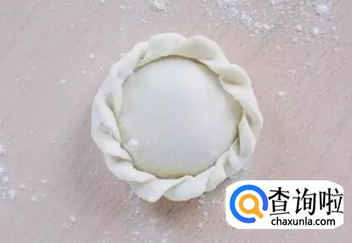 取饺皮一张于掌心,放入适量馅,把馅放成一个圆形,取另一张,饺皮盖上,把上面的饺皮按照馅的形状轻按定形,将两张饺皮叠起来的边定一起点将之捏薄,将变薄的顶端往下按,连续向下按捏形成葵花状。 - 04