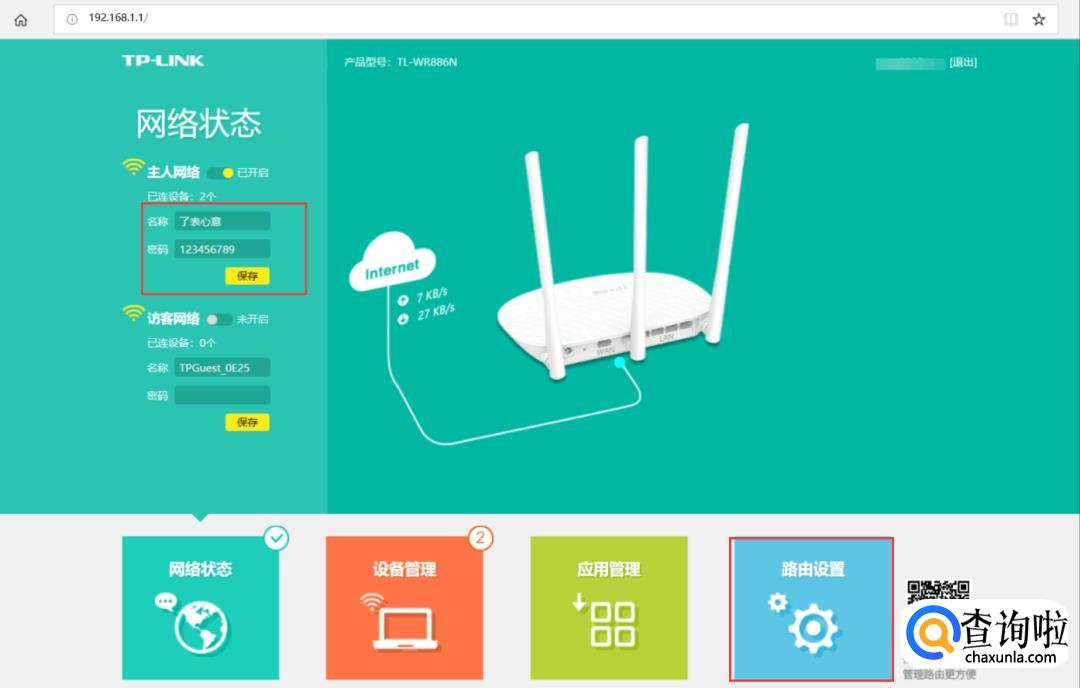 登陆进入路由器主页面,可以直观的看见自己设置的wifi名称、密码、以及状态,在红框内的密码一栏,可以直接编辑密码并点击【保存】即可修改: