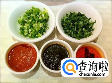 准备好腐乳汁,葱花,香菜,黄豆酱,辣椒油等食材。