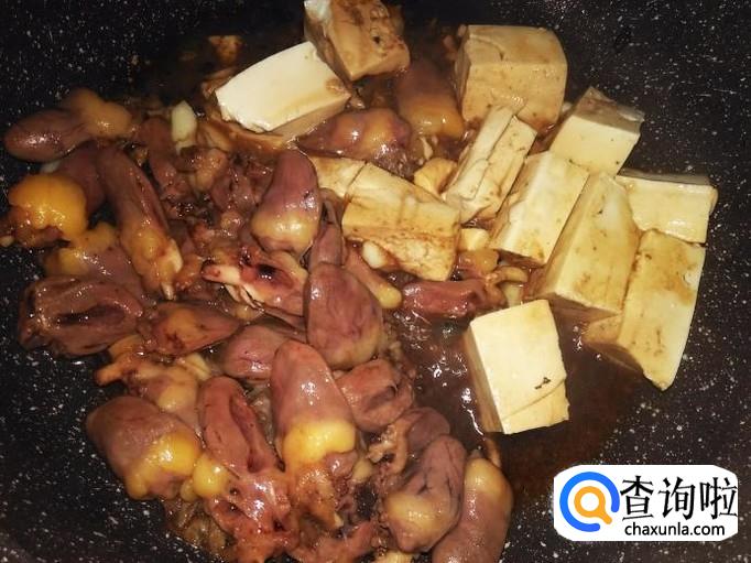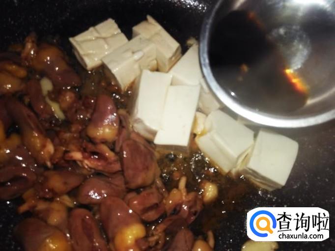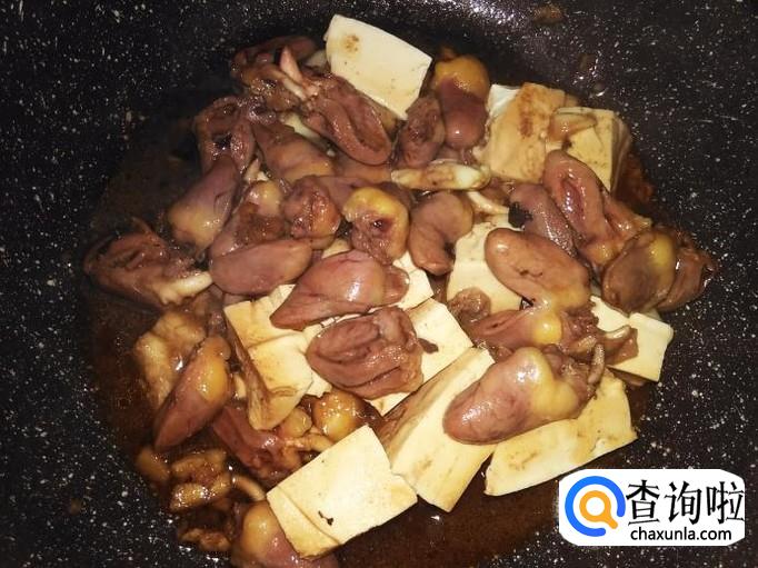 然后混合鸡心翻炒均匀盖上盖子小火焖。【不要加水,因为鸡心和水豆腐含水量很多】