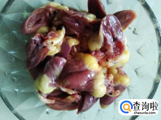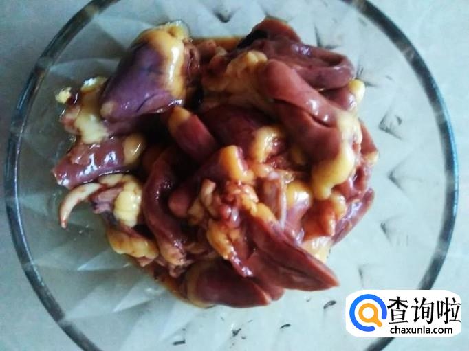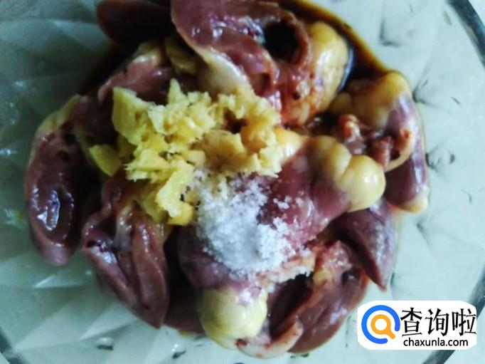 鸡心里加适量的盐、姜蓉、生抽、料酒腌制几分钟。