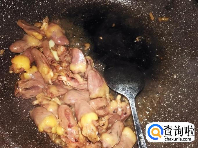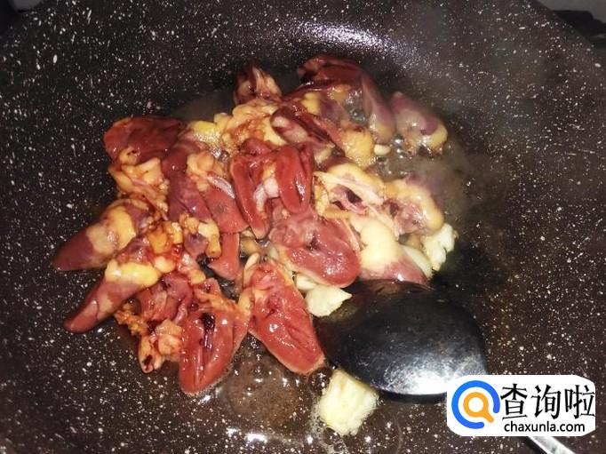 鸡心下锅,大火翻炒至变色,然后铲到锅边,再下适量的油到锅空格。