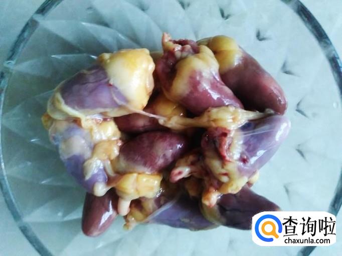 鸡心清洗干净,然后把每个鸡心切成两边。