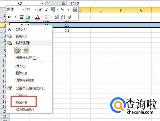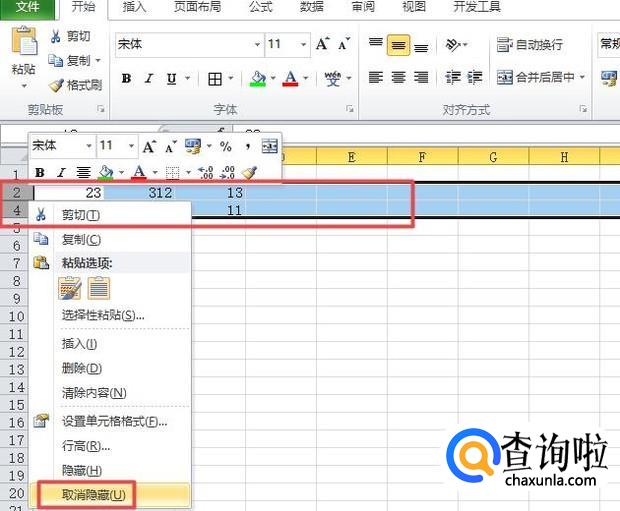 想要取消隐藏的话,我们选中2到4行,然后右击选择取消隐藏;