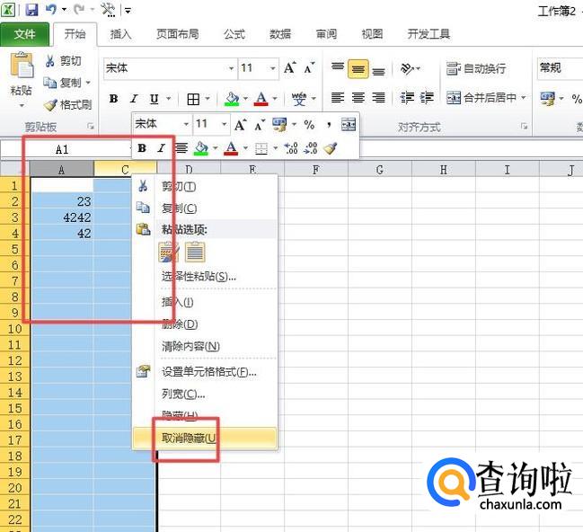 我们选中A到C列,然后右击选择取消隐藏,之后就会取消隐藏了,如图所示。