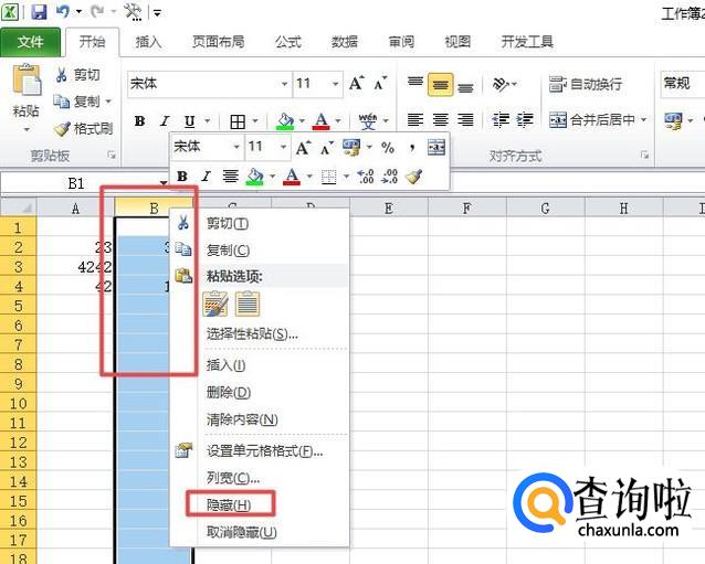 我们选中B列,右击选择隐藏,之后就会隐藏了,如图所示;