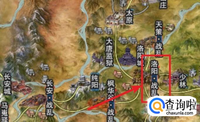 点击后,出现世界地图,我们在世界地图上找到并点击‘洛阳-战乱’这个地点。