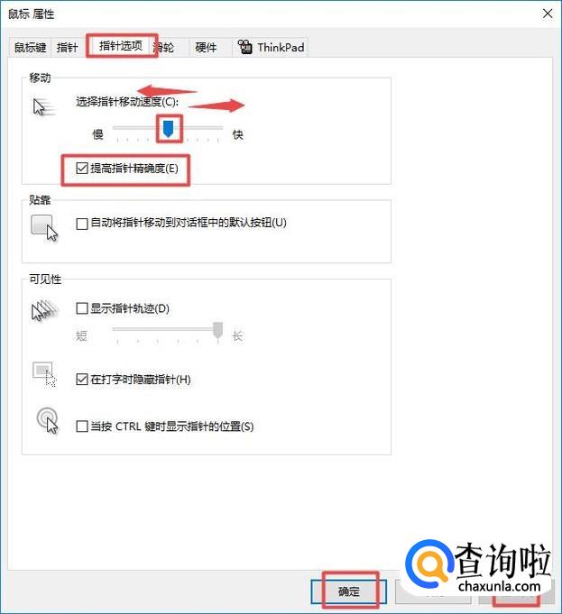 弹出的界面,我们点击指针选项,然后我们先勾选上提高指针精准度,然后我们将选择指针移动速度的滑动按钮进行向右或者向左滑动调试,但觉得适合自己使用的时候,我们点击应用,之后我们点击确定,这样我们就解决这个问题了。