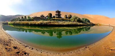 月牙泉位于月牙泉风景区,古称沙井,俗名药泉,位于甘肃省敦煌市西南5公里鸣沙山北麓。
