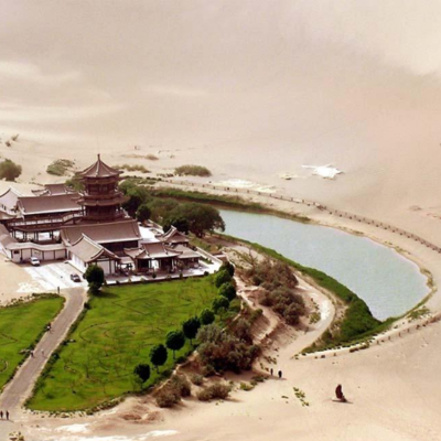 月牙泉早在汉代就是游览胜地。唐代有船舸,泉边庙宇。泉南岸原有一组古朴雅肃、错落有致的建筑群,从东向西计有娘娘殿、龙王宫、菩萨殿、药王洞、雷神台等百余间。各主要殿宇有彩塑百尊以上,所绘壁画数百幅。重要殿堂均悬置匾额、碑刻,如“第一泉”、“别有天地”、“半规泉”、“势接昆仑”、“掌握乾坤”等,书法雅俊,堪称上品。当时这里亭台楼阁,庙貌辉煌,宫厅柱廊,临水而设。林木蓊郁,泉光与山色相映,古刹神庙,绕以常年香火。历代骚客游玩,吟诗咏赋,挥毫者不乏其人。史载,汉元鼎四年(前113年),汉武帝得天马于渥洼池中,后人疑月牙泉即汉渥洼池,遂立一石碑曰“汉渥洼池”。“四面风沙飞野马,一潭之影幻游龙”。由是,奇特的月牙泉更增添了传奇色彩。