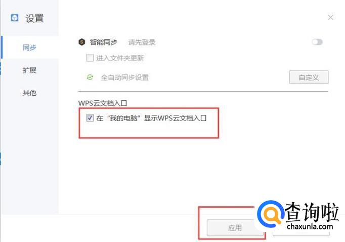 在设置中,把“WPS云文档的入口”打钩给去掉,然后再点击”应用“,这样就看不到WPS云文档的图标了。