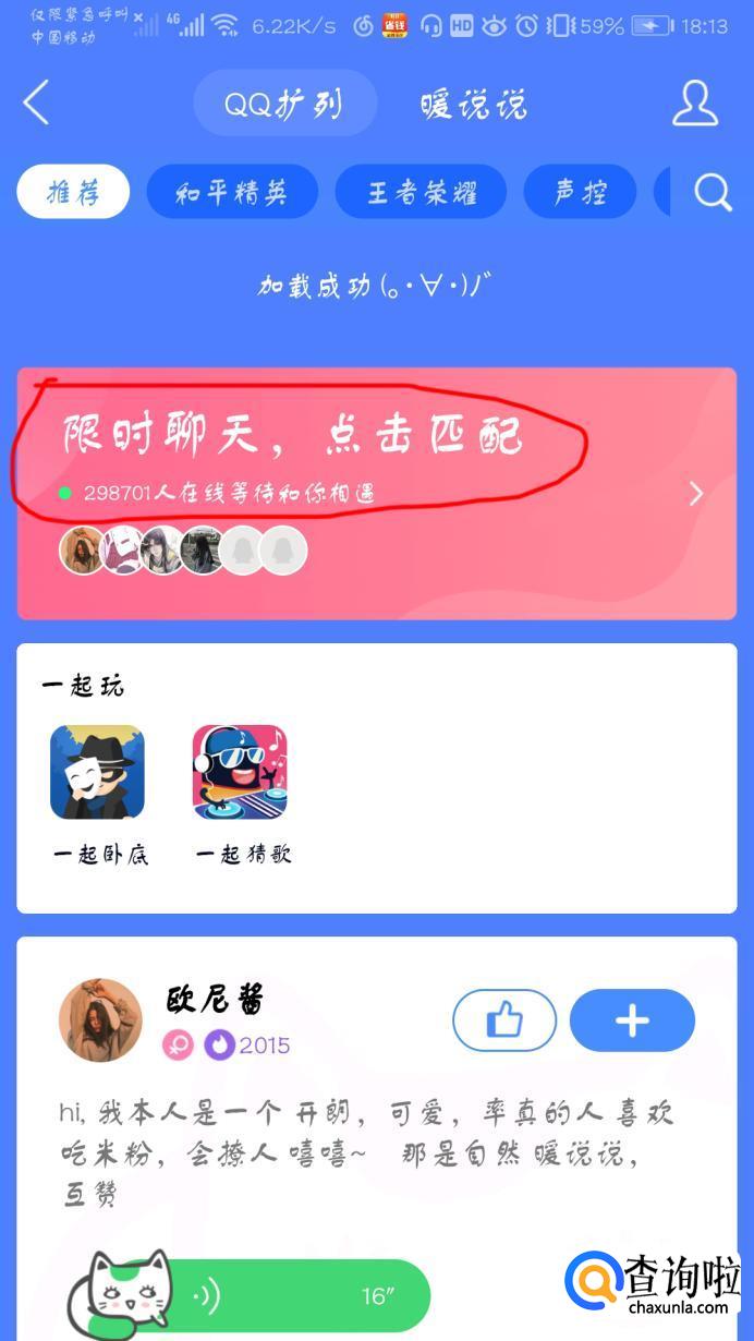 点击扩列,进入界面。点击“限时聊天,点击匹配”。
