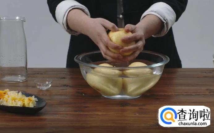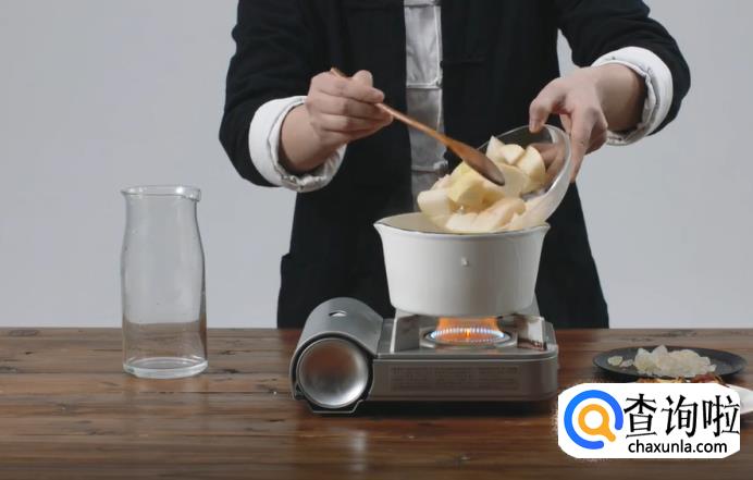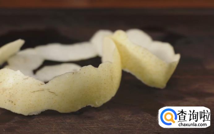 在温水中放入适量淡盐水,再把雪梨放进去洗干净。接着把雪梨的皮削掉,梨皮留用,雪梨肉切成小块。