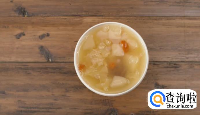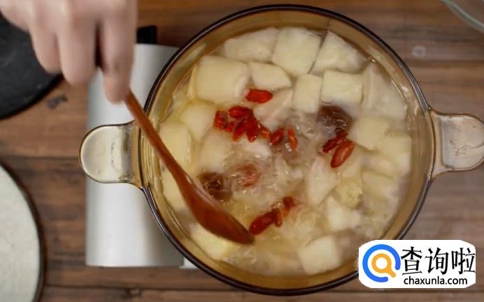 煮10分钟之后,撒点枸杞,继续煮10分钟,等水量煮到原来的一半,梨汤变得浓稠的时候,就可以关火出锅了。