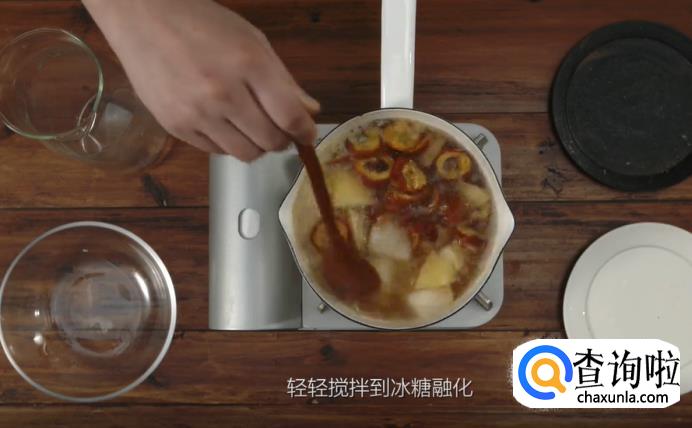 再次煮沸之后转成小火,慢煮20分钟,这道山楂雪梨冰糖水就做好了。