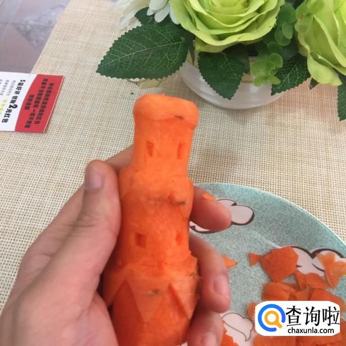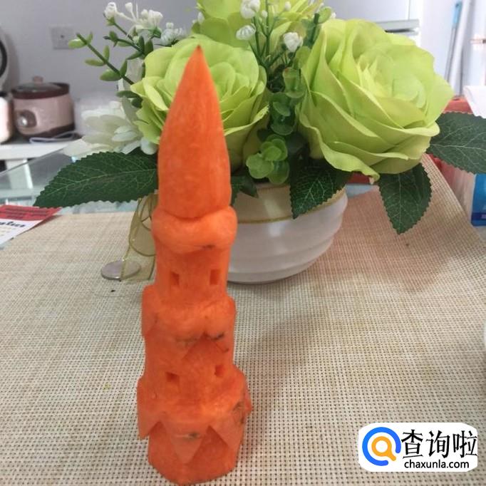 最后把宝塔的顶安在塔身上就可以了。一个用胡萝卜刻成的宝塔就做好了,希望大家能够喜欢。