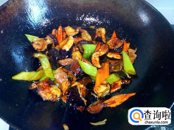 把炸好的茄子放入锅中,颠勺翻个,然后把勾兑好的芡汁,倒入锅中。
