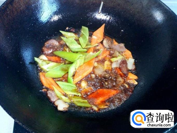 放入胡萝卜炒至变软,放入尖青椒略翻炒一下,然后放入料酒,白糖,少许醋,五香粉,酱油,盐,味精,烧成汁。