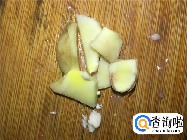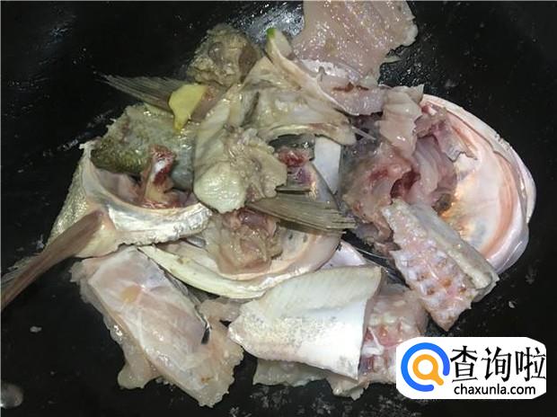 把锅烧热,倒入适量的花生油,油后,放入姜片煸香,然后把鱼头和鱼骨一起倒入锅中,翻炒,把鱼骨和鱼头煎几分钟。