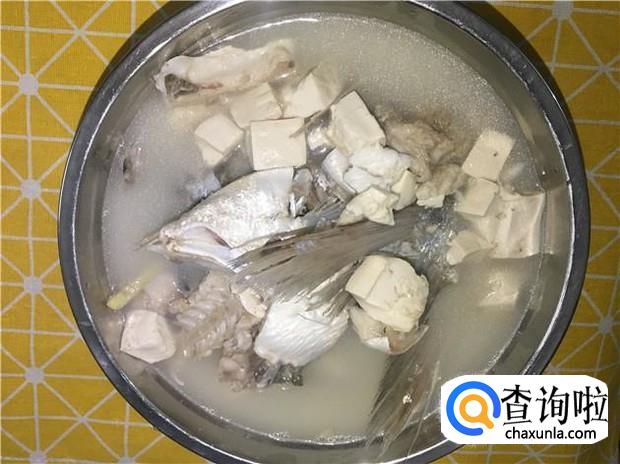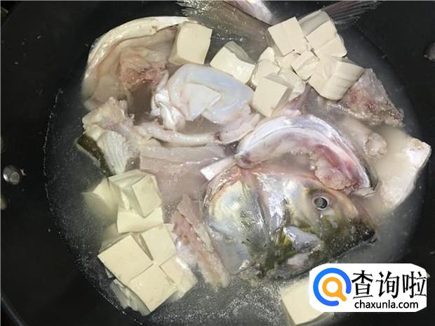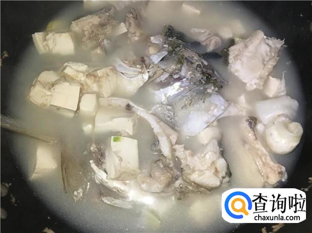 大火煮开后,再转中火炖,一定要把鱼骨和鱼头的香味给炖出来,最后加入少许的盐,即可出锅。