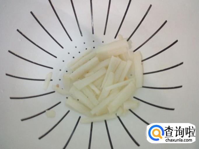 山药去皮,用水清洗干净,控干水分,切成条。放入水中浸泡一下,然后用水投洗一下,控干水分。