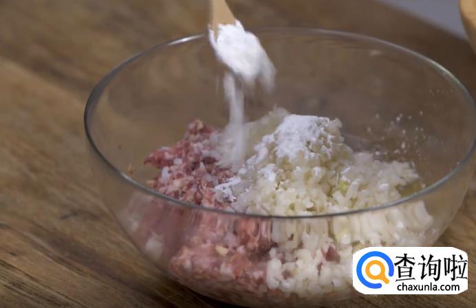 将剁好的肉糜装碗,再加适量的盐、白胡椒粉和生抽,一起搅拌均匀,然后腌制20分钟入味。