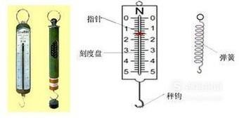 首先认识弹簧测力计的构造。其由刻度盘、弹簧、吊环、指针、挂钩组成。