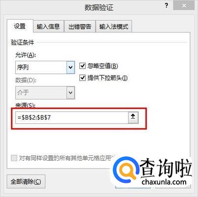 在“输入源”中输入“=B2:B7”,或用鼠标选中B2:B7内容,点击确定。