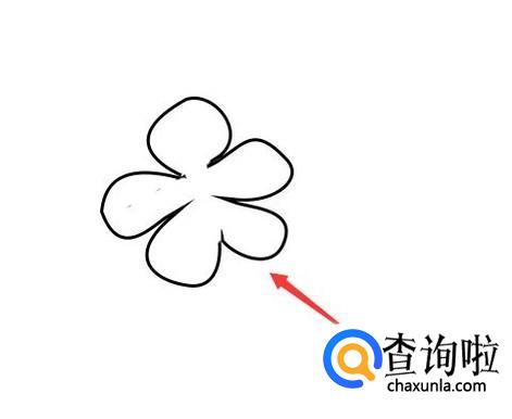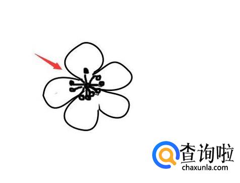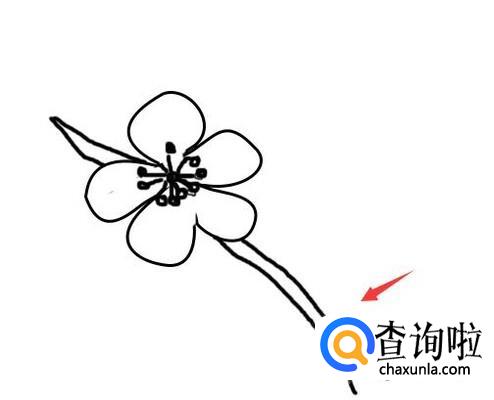 先画一个五瓣的花朵,在花朵的中间画出花心和花蕊,再给花朵画上枝干等,最后使用橡皮进行修正即可。