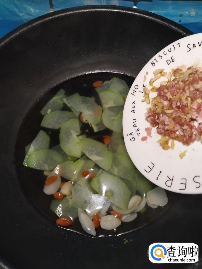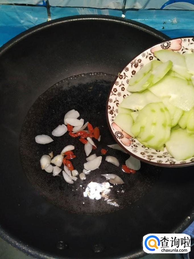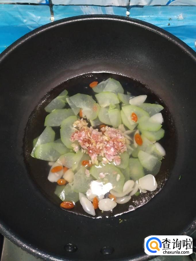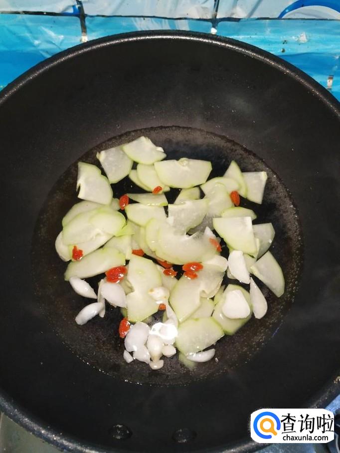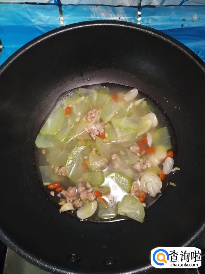 将准备好的佛手瓜片儿倒入锅中,大火将水烧开,水开后转小火,煮五六分钟左右。