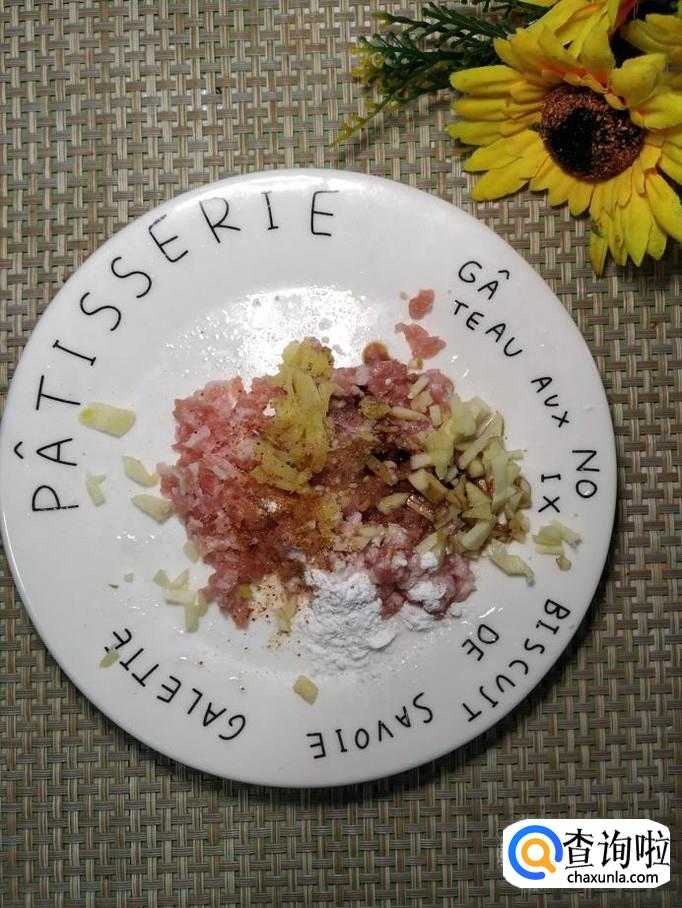 准备适量五花肉,洗净后,用刀剁碎,再准备适量生姜,洗净后切碎,放在上面,加入适量盐,鸡精,五香粉,生抽,料酒,淀粉适量,搅拌均匀,腌制十分钟左右。