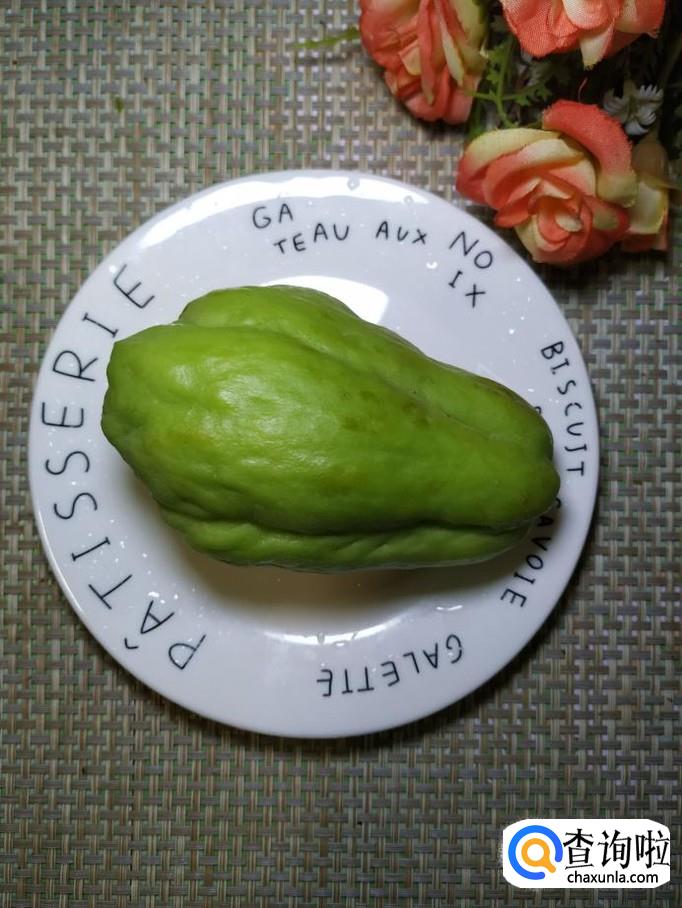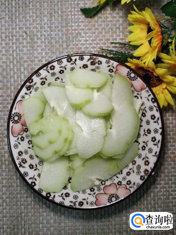 准备一个佛手瓜,洗净后,去除外皮,去除内瓤,用刀切成片,放入盘中备用。注意,佛手瓜的皮非常薄,不想去皮也是可以的。