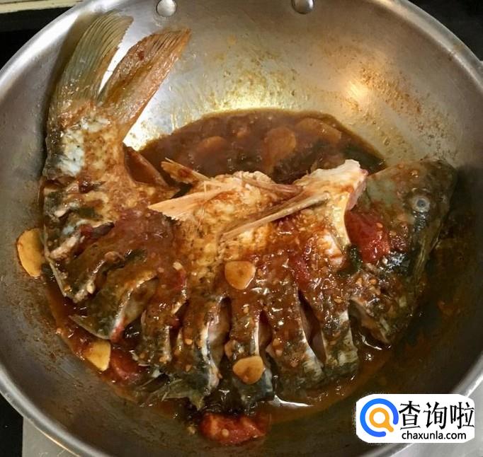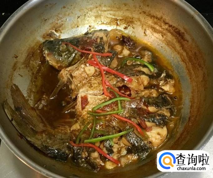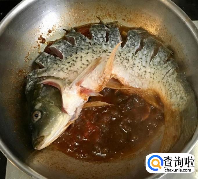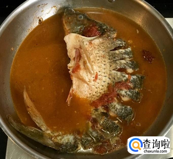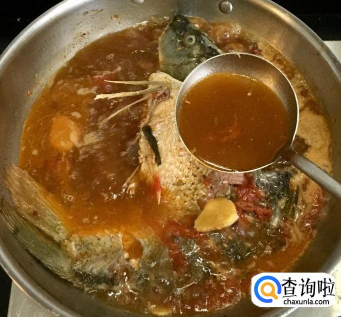 加入适量的清水和盐调味儿大火煮沸撇去浮沫,改中火慢炖并经常的把汤汁向鱼身上浇一浇