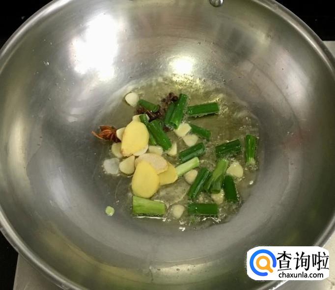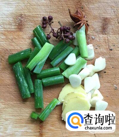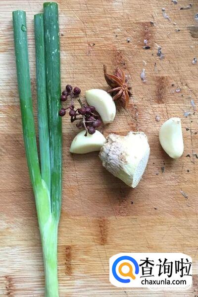 葱、姜、蒜剥去外皮清洗干净分别切成葱段、姜片、蒜片,八角、花椒冲洗干净备好